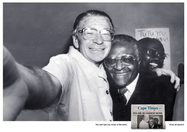 Figuur 1 is ’n voorbeeld van ’n boodskap wat gedeeltelik/grootliks direk uit die verlede verkry is. Alhoewel die foto van Beyers Naudé en emeritus aartsbiskop Desmond Tutu aangepas is sodat dit die idee skep dat hulle ’n “onsie” met ’n selfoon neem, is die foto in werklikheid geneem toe laasgenoemde die Nobelprys vir Vrede in 1984 ontvang het. Die abstrakte begrippe onmiddellikheid en intimiteit word hier verkonkretiseer met die suggestie van ’n selfoon wat ’n onsie neem. Dit hou dus verband met die seleksiebeginsel wat in die voorbeeldmateriaal gebruik is.