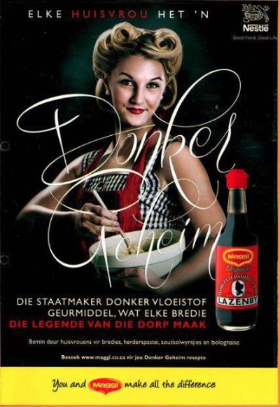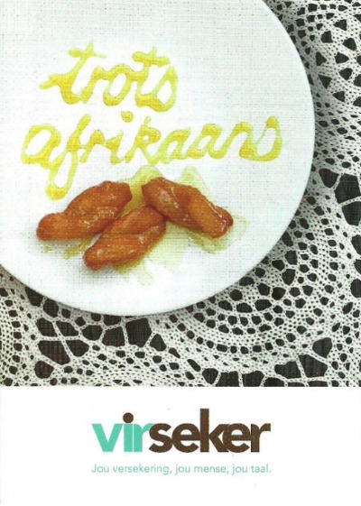 Die uitspraak word ook onderskryf in die ondersoek van Merchant en Rose (2013:2620) waarin daar pertinent aangedui word hoe emosie handelsmerk-erfenis/-lojaliteit beïnvloed. Uit die ondersoek en voorbeeldmateriaal blyk dit dat nostalgie as konstruk in emosionele advertensie-appèlle kultureel ingebed is. Talige tekens wat herinner aan ’n bepaalde kinderliedjie uit teikenmarklede se verlede, of visuele tekens wat herinner aan hul tienerjare, is nie universeel nie, dit is kultuurspesifiek. Die gebruik van koeksisters en hekellappies as visuele teken van Afrikaanssprekendes se kultuurerfenis in ’n versekeringsadvertensie gerig op Afrikaanssprekendes (virseker in Huisgenoot, April 2012) is so ʼn voorbeeld (Figuur 3).