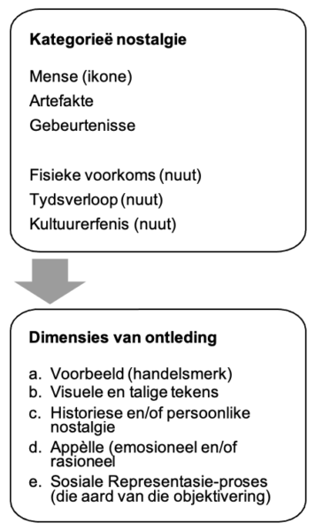 ’n Diagrammatiese voorstelling van die aanwending/gebruik van nostalgie as bemarkingstegniek maak aldus die bogenoemde konseptuele model (Tabel 1) voorsiening vir verkonkretisering van die kategorieë nostalgiese verteenwoordiging aan die dimensies van analise.