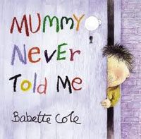 Dit is presies waar Mummy never told me inpas. (Later in Afrikaans uitgegee, deur Human & Rousseau, as Mamma het my nooit vertel nie.) Babette Cole stel al hierdie vrae op só ’n manier dat die kwessies aangeraak word, maar baie, baie belangrik is die antwoord teen die einde: Eendag, as jy reg is, sal Mamma jou vertel.