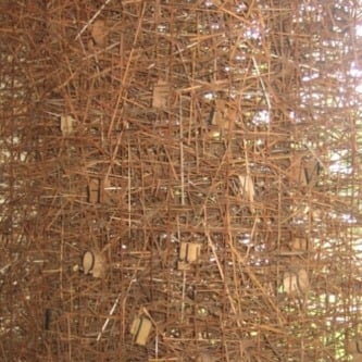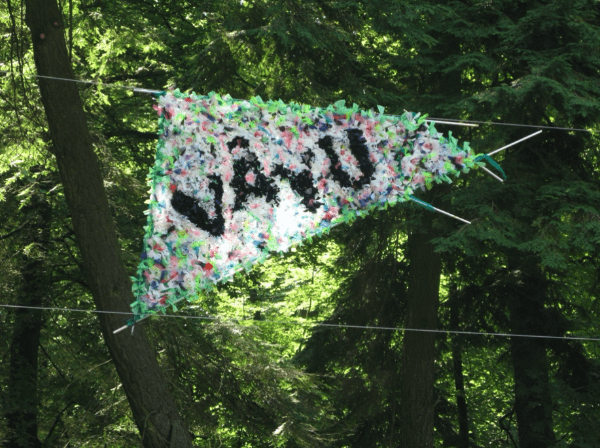 Figuur 2: Willem Boshoff (1951–), Windwoorde (Vãyu) (2008). Ses “vlieërs” of “blare” geweef uit herwinde plastiek opgehang in ’n woud of tussen geboue aan staalkabels. Afmetings veranderlik. Arnhem, Nederland. Willem Boshoff Argief, Universiteit van die Vrystaat, Bloemfontein.