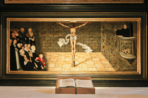 Figuur 11: Lucas Cranach die Ouere (1472–1553), Die predella van die Reformasie Altaarstuk te Witteberg (1547/1548). Tempera op houtpaneel. 447 cm x 562 cm (altaarstuk in sy geheel). Evangeliese Stadskerk van Sint Maria, Wittenberg. https://fotoeins.com/2017/10/30/lutherstadt-wittenberg-stadtkirche-stmarys (28 September 2020 geraadpleeg).
