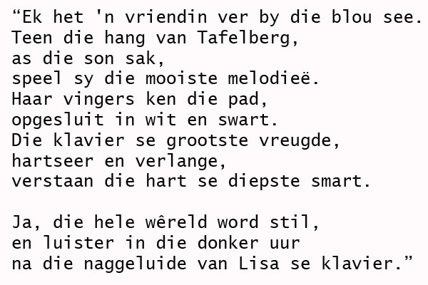Toe ek Liza die eerste keer sien, deur die venster van 'n pizzaplek waar ek gesit en eet het in Oranjestraat, was ek dadelik verlief op die pragtige meiisie. Sy was, het ek opgelet, in die geselskap van Nataniël. Op daardie stadium was ek ietwat van 'n "predator" as dit kom by verhoudings, iets waarop ek vandag nie trots is nie. Getrou aan my geaardheid het ek berge versit om Liza se adres uit te vind, en vir haar gaan kuier. Alte gou het ek besef dat ons te min gemeen gehad het om 'n liefdesverhouding te begin. Ek moes 'n moeilike keuse maak. Sou ons vriende kon word? Ons het. Ek dink vandag nog dat Liza een van die meisies is wat ek beter behandel het as die res. Behalwe vir een ding. Ek het op haar ge-"sponge" vir geld, vir tee, vir kos, sulke goed. Dit het erger geraak toe ek intrek in 'n woonstel net onder haar. Ek was 'n volslae hooligan, en my teenwoordigheid moes soms vir haar seker steurend gewees het. Nadat ek vir die soveelste keer klein bedraggies geld by haar geleen het sonder om dit ooit terug te betaal, wou ek weer R40 leen. Met die tipiese vindingrykheid van 'n bankrot musikant het ek gou-gou een aand die rympie "Lisa se klavier" neergepen en dit onder haar deur gaan insteek. Dit het haar hart versag, en die volgende dag het sy waaragtig vir my R40 geleen (ek skuld haar dit tot vandag toe). Eers 'n paar weke later het ek weer die verspotte rympie in haar woonstel sien lê en besluit om dit maar te toonset. Nooit het ek verwag daardie stukkie oneerlike woordmanipulasie sou 'n treffer word nie. Aan die ander kant: Was die rympie régtig net bullshit? Of was dit dalk onbewus tog eerlik? As ek vandag na die liedjie luister, besef ek dat dit ons vriendskap tog perfek beskryf, en kry ek mooi herinneringe aan ons beste oomblikke saam ... en dink ek weer aan al daardie aande toe sy my getroos het met haar klavierspel, appelkoostee, en selfs rugmasserings. In 'n donker tyd vol woede, verraad en pyn, was Liza se vriendskap vir my 'n ligpunt wat altyd sal uitstaan as iets moois en suiwers en eenvoudig, byna soos 'n geskenk van Bo. Dankie Liza! |