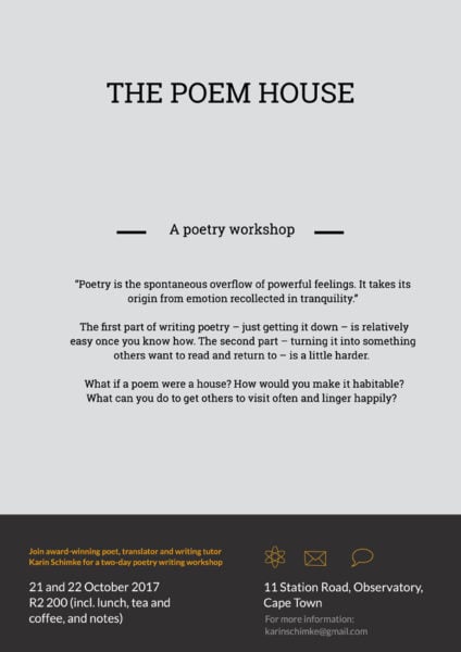 To take part in her workshop The Poem House, which will be presented in Cape Town and Johannesburg in October and November, email karinschimke@gmail.com.