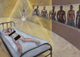 Jy vra dat mense jou skildery moet probeer verstaan deur verder daaroor na te dink. Ek het gekyk en gekyk en steeds sien ek net ’n ry sterk swart mans wat staar na ’n kaal vet wit vrou wat op ’n bed lê. Ek verstaan dit is rassisme en dat dit gaan oor ’n nagmerrie wat jy gehad het, maar ek het nou gedink en gedink, maar ek verstaan steeds nie wat jy verder probeer sê nie.