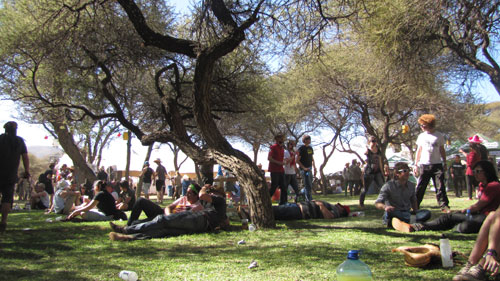 Dis 16:00 en ons is uitgestrek in die koelte op die grasperk net regs van die James Phillips-verhoog. Die mense is gesellig en Fridge Poetry se ska-klanke is heerlik salig. ’n Groep mense span ’n tou tussen twee bome en begin daarop te loop. Dié kêrels weet van balans hou, van nie ommoer nie. Dis vir my prontuit ’n metafoor vir wat by hierdie fees aangaan, want as jy hier val, mag jy dalk nie weer voor Sondag opstaan nie ...