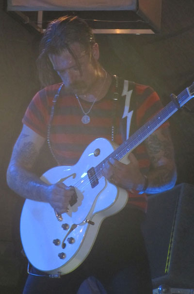 Jesse Hughes van Eagles of Death Metal speel die wit waks uit sy kitaar uit.