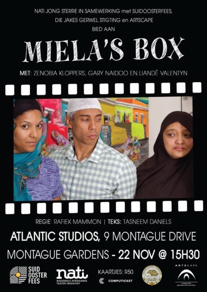 Een vannie dinge wat vi my surprise’t oo Miela’s Box was hoe funny die audience die play gevind’t. Ek’t eintlik daai play geskryf van ’n baie serious plek binne-in my – ek wou comment oppie consequences van families wattie belangrike family issues resolve voodat familie deaths gebeur nie, en op various Muslim female familie perspectives. Ek gloe ek’t daai objective achieve, maa dan was daa tye wanner die audience net heeltemal uitgebas’t vannie lag – en op random tye wanner ek was like “Maa nou hoekom was daai funny?”