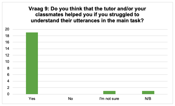 In die negende vraag word uitgebeeld wat die deelnemerperspektief op die bruikbaarheid van pedagogiese tolking as interaksie vir die begrip van Afrikaanse uitings in die hooftaak is. Die meerderheid (19) het “ja” gekies, een was nie seker nie en een het die vraag oorgeslaan. Die transkripsies getuig daarvan dat studente nie soseer met die begrip van Afrikaanse uitings gesukkel het nie aangesien daar slegs twee gevalle van begripskontrole was.