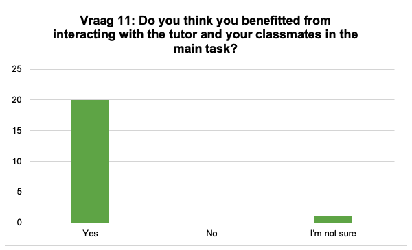 Die elfde vraag het gelui of die deelnemer dink sy het by die interaksie met die tutor en haar klasmaats in die hooftaak gebaat. Twintig van die deelnemers het “ja” omkring en vind dus baat by pedagogiese tolking as interaksie vir samewerking tussen alle partye. Die volgende uittreksel beeld die verskynsel effektief uit: