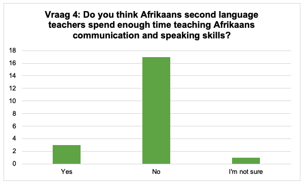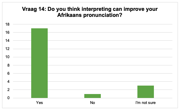 According to the questionnaire results, the biggest challenge associated with a pedagogical interpreting task is the time it takes to complete, which can be managed with effective planning and implementation. This also constitutes positive feedback, since participants requested more time for more interpreting activities. The use of pedagogical interpreting as a teaching technique clearly has potential value for Afrikaans second-language acquisition, and the second article elaborates on the role that interaction plays in this respect. All the participants’ overall impression of the tutorials with pedagogical interpreting was positive. Half of the participants emphasised pedagogical interpreting as an effective and valuable teaching technique for Afrikaans second-language acquisition, and the other half emphasised the innovative and enjoyable nature of pedagogical interpreting as a teaching technique. All the participants recommend pedagogical interpreting for Afrikaans second-language teaching in their classrooms. In the last open-ended question in the questionnaire they wrote that pedagogical interpreting is valuable for comprehension, vocabulary, pronunciation, self-confidence as well as general language skills. They further mention that the technique is a simple, interactive, enjoyable and stress-free way to use Afrikaans in context. As can be deduced from the learner-based evaluation, all the participants in the study consider pedagogical interpreting to be a valuable teaching technique for Afrikaans second-language acquisition.