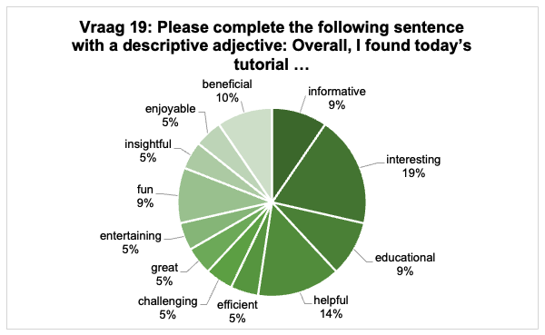 Vraelyste is geneig om kwantitatief te wees en makliker afdoende bevindinge te genereer. Die vraelys vir die drie tutoriale, wat in Engels vir die betrokke deelnemers opgestel is,8 begin met wie die navorser is, waaroor die studie handel, wat die doel van die vraelys is en die versekering van vertroulikheid en dat daar geen regte of verkeerde antwoorde is nie. Dit bevat 20 vrae van ’n verskeidenheid soorte, waarvan vrae 1–4 en 12–20 se resultate in hierdie artikel bespreek word. Die meerderheid vrae is geslote vrae met ’n Ja/Nee-opsie asook Ek is nie seker nie as opsie vir tydbesparing omdat dit tydrowend is om antwoorde uit te skryf. Die vraelys sluit af deur die respondente vir hulle deelname te bedank.