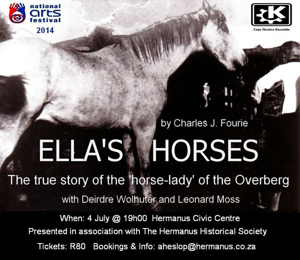 Die Hermanus Historiese Organisasie bied in samewerking met die bekroonde dramaturg en regisseur Charles J. Fourie van Pringlebaai ‘n aand van toneel aan by die Hermanus Burgersentrum. Die produksie Ella’s Horses is gebaseer op die werklike verhaal van die ‘perdevrou van Hermanus’. Die deernisvolle en treffende toneelstuk vertel die verhaal van die eksentrieke Ella Gordon, wat ‘n ooreenkoms met haar dominee wil aangaan om haar geliefde perde en honde saam met haar hemel toe te vat. Ella was ‘n Skotse immigrant wat na Suid Afrika toe gekom het saam met ‘n reisende sirkus gedurende die vroeë 1900’s. Sy het eers in Hermanus gaan woon maar haar later op die plaas Karwyderskraal gevestig waar sy ‘n kerk en skool vir die plaaslike gemeenskap gebou het. Die perde begraafplaas waar sy haar diere begrawe het kan vandag nog op die plaas Karwyderskraal buite Hermanus besigtig word. Die produksie word opgevoer om fondse in te samel vir die Hermanus Historiese Organisasie wat dit ten doel het om Hermanus se geskiedenis te bewaar en aan ‘n nuwe geslag bekend te stel. U ondersteuning van die gebeurtenis sal hoogs waardeer word.