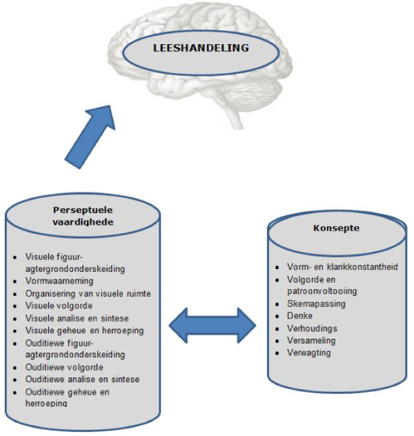 Die leeshandeling behels ’n verskeidenheid perseptuele vaardighede wat figuur-agtergrondonderskeiding, vormwaarneming, volgorde, analise, sintese, assosiasie, geheue en herroeping insluit en met konsepte verband hou. Leesbegrip berus nie slegs op die integrasie van die verskillende sensoriese modaliteite nie, maar ook op die vorming van konsepte en die akkommodasie en assimilasie van konsepte in die bestaande kennis (Andrich, Hill en Steenkamp 2015; De Witt en Lessing 2018a). So sal die blootstelling aan ’n verskeidenheid klanke die ontwikkeling van neurale bane onderliggend aan ouditiewe persepsie tot gevolg hê. Die ontwikkeling van ouditiewe persepsie vorm die grondslag vir hoër-orde-prosesse soos spraak en taalbegrip (Greenough in Bick en Nelson 2016) wat ’n rol speel in leesverwerwing.