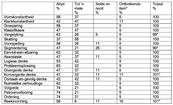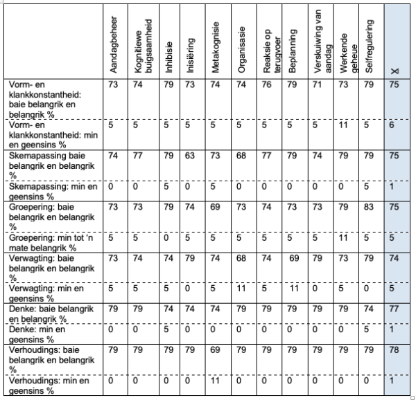 Konsepvorming en die gebruik van konsepte in leer- en die leeshandeling berus eerstens op die verwerwing van perseptuele vaardighede en die verskillende aspekte van die uitvoerende funksie van die brein (Stauffer, Abrams en Pikulski 1978; Campbell 2015). Die kundiges se positiewe evaluering van ons voorgestelde aktiwiteite versterk ons argument dat perseptuele vaardighede, konsepvorming en die uitvoerende funksie van die brein interafhanklik is en onlosmaaklik deel van die leer en leeshandeling is. Die data wat deur die Delphi-evalueringslys gegenereer is, bevestig dat die voorgestelde aktiwiteite perseptuele vaardighede, konsepvorming en die uitvoerende funksie van die brein bevorder.