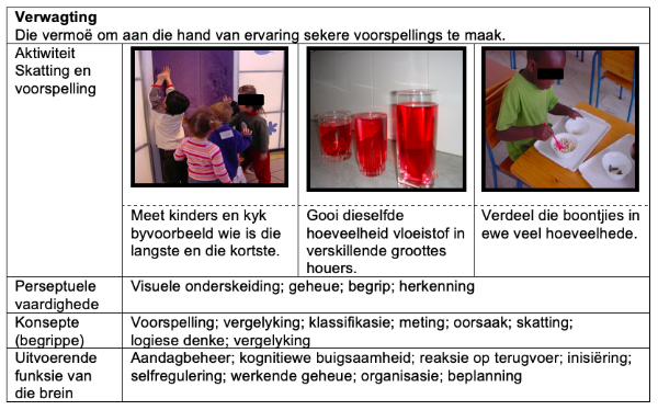 Met die konsep verwagting kan die kind nou deur ervaring sekere voorspellings maak. Dit is moontlik slegs indien die kind op ’n ryk ervaringswêreld staat kan maak en onderlinge verbande kan insien. Daar kan dus van die kind verwag word om deur logiese denke sekere afleidings van gegewe inhoud te maak. Hierdie konsep ontwikkel eers teen ’n latere ouderdom en is afhanklik van die stimulerende ervaringe wat aan die kind gebied word deur sy omgewing. Verwagting impliseer heelwat bepalers, soos voorspelling, vergelyking, klassifikasie, meting, oorsaak. skatting, logiese denke en vergelyking (Tabel 6).