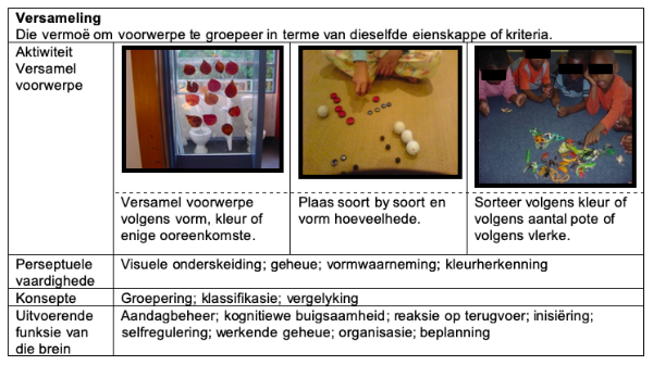 Tabelle 2 tot 9 gee ter illustrasie voorbeelde van enkele aktiwiteite wat met die voorskoolse kinders gedoen kan word en verskaf ons interpretasie van die toepassing van onderliggende perseptuele vaardighede en konsepte sowel as die toepaslike aspekte van die uitvoerende funksie van die brein in aktiwiteite met die voorskoolse kind.