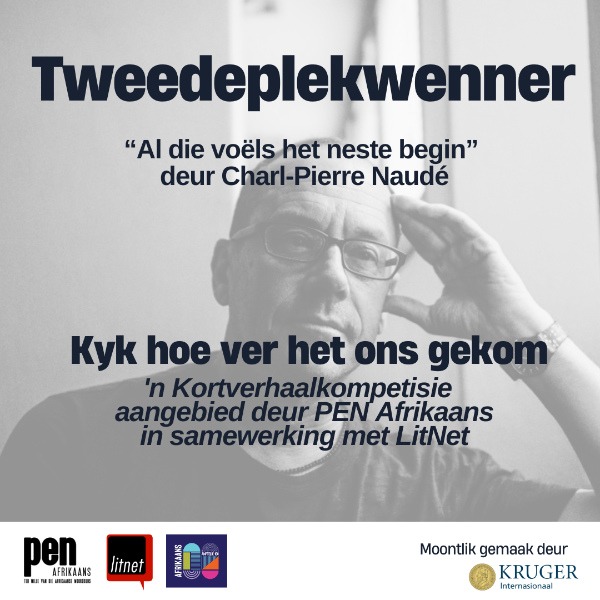 Tweede plek: “Al die voëls het neste begin” deur Charl-Pierre Naudé (Sien: https://www.litnet.co.za/al-die-voels-het-neste-begin/)