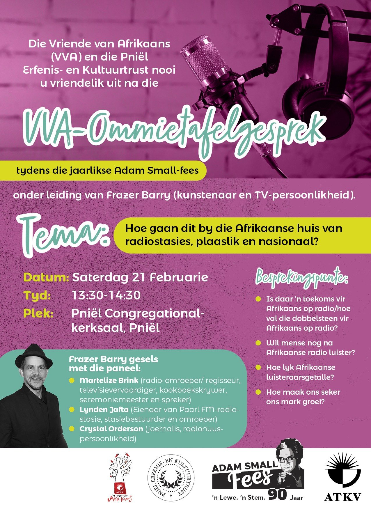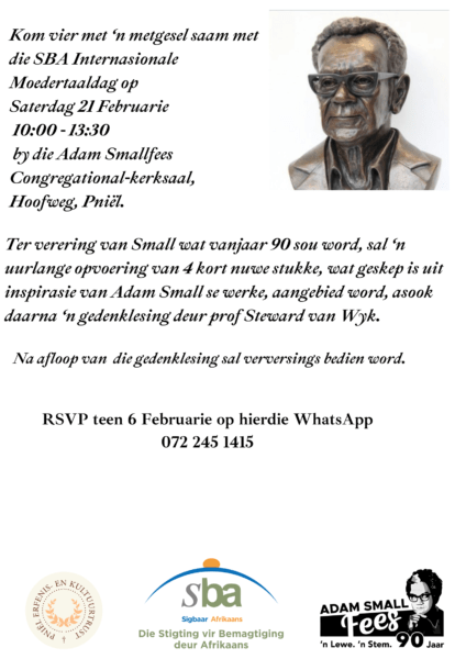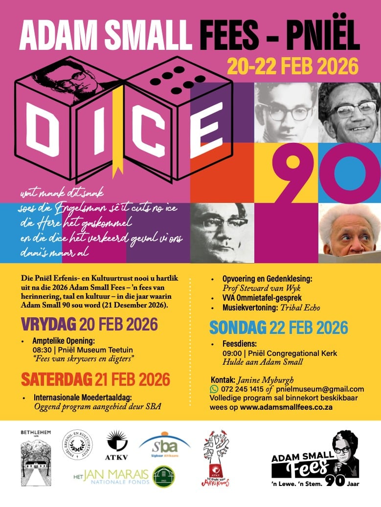 Die Pniël Erfenis- en Kultuurtrust nooi u hartlik uit na die 2026 Adam Small-fees – ’n fees van herinnering, taal en kultuur – in die jaar waarin Adam Small 90 sou word.