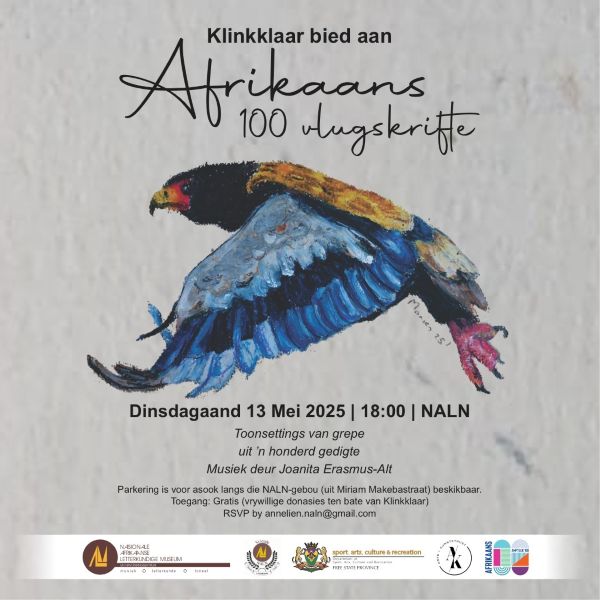 100 Vlugskrifte word op 13 Mei 2025 om 18:00 by NALN aangebied. Toegang is gratis, maar vrywillige donasies ten bate van Klinkklaar sal verwelkom word. RSVP by annelien.naln@gmail.co.za