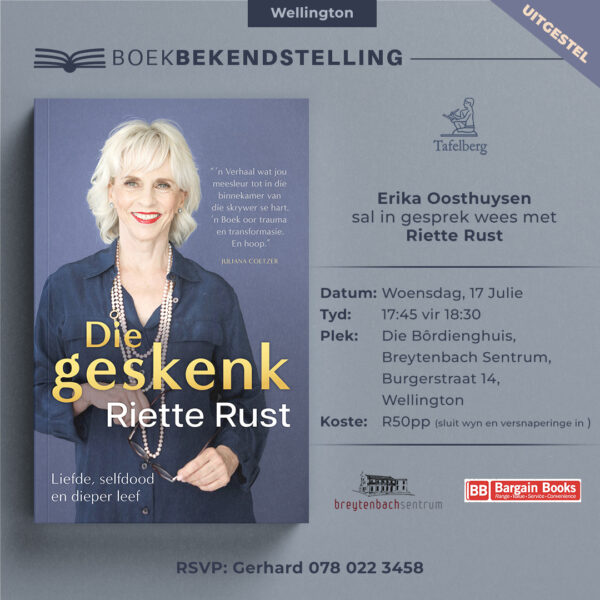 Riette sal op die volgende plekke oor haar boek gesels: Wellington, Tygervallei, Kaapstad, Somerset-wes, Garsfontein, Zambezi en Lynnwood. Ook op Netwerk24!