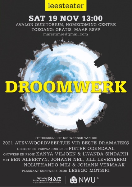 Droomwerk as leesteater begin om 1nm op Saterdag 19 November en word met ’n glas Saronsberg-vonkelwyn aangebied. Daar sal ook na die tyd geleentheid wees om die akteurs en kreatiewe span te ontmoet. Die projek word moontlik gemaak deur die National Arts Council en die NWU.