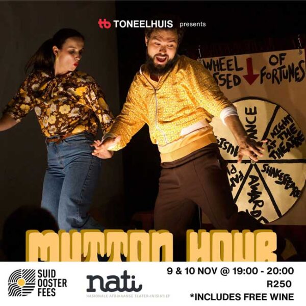 Mutton Hour bestaan uit kort sketse rondom lewensbelangrike sake: die liefde, verlies, krokodille en katte. Mutton Hour is hartverwarmende nonsens, liefdevol bymekaar gebring deur Suid-Afrika se beste en mees talentvolle teatermakers. Hulle kombineer musiek en kamishibai. Geskik vir enigeen wat lus het vir teater. Dis nie bedoel vir kinders jonger as 16 jaar oud nie (maar hulle ongetwyfeld al erger dinge op die internet teëgekom). In Afrikaans en Engels.