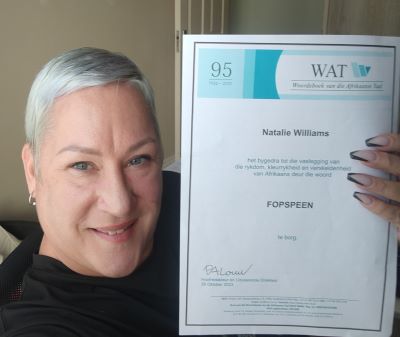 Natalie Williams, ’n Engelssprekende van Durbanville, is met ’n gelukkige trekking aangewys as die 2024-wenner van die Woordeboek van die Afrikaanse Taal se Borg ’n Woord-Sanlamprys van R25 000. Die trekking is onlangs deur die WAT-direksievoorsitter prof. Hester Klopper en dr. Phillip Louw, hoofredakteur en uitvoerende direkteur van die WAT, behartig.