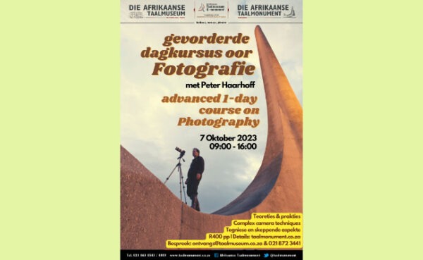 Beide kursusse vind by die Taalmonument op Paarlberg vanaf 09:00 tot 16:00 plaas. Dit kos slegs R400 per persoon, wat ’n gratis besoek aan die monument asook verversings insluit. Deelnemers kan hul eie middagete bring of die Suikerkan-bistro ondersteun, waar hulle 15%-afslag ontvang. Deelnemers moet hul eie DSLR-kamera of enige kamera met handmatige beheer (manual control) bring – geen selfoonkameras nie. Plekke is beperk, dus bespreek asseblief vroegtydig by Elsabè Pearce op 021 872 3441 of ontvangs@taalmuseum.co.zaom deelname te verseker. Meer oor Peter Haarhoff by flickr.com/people/peterhaarhoff/.