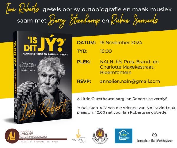 Kom kuier saam! Ian Roberts gesels oor sy outobiografie en maak musiek saam met Barry Steenkamp en Ruben Samuels op 16 November 2024 om 10:00 by NALN. Volg hierdie skakel vir meer inligting.