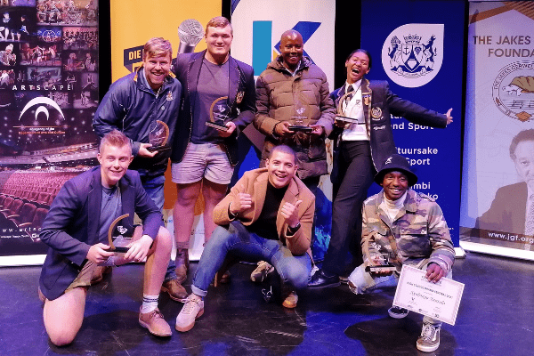 Wenners van 2021 se Hoërskool Dramafees: Zander Oberholster, Le Roux de Vos en Barnie Mans vir Neer daal die reën (Hoërskool Martin Oosthuizen); Elzaan Daniels vir Om teen treine te skree (Jan van Riebeeck Hoër); Lukhanyo Langa en Ayabonga Yantolo vir Ivili (Ihkwezi-teatergroep); en Dean Smith, een van die beoordelaars.