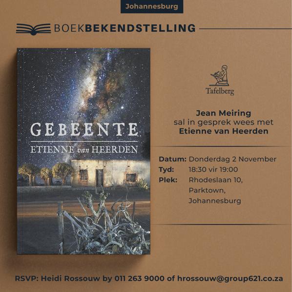 Jean Meiring sal op 2 November 2023 in Parktown, Johannesburg, gesels met Etienne van Heerden oor sy roman Gebeente.