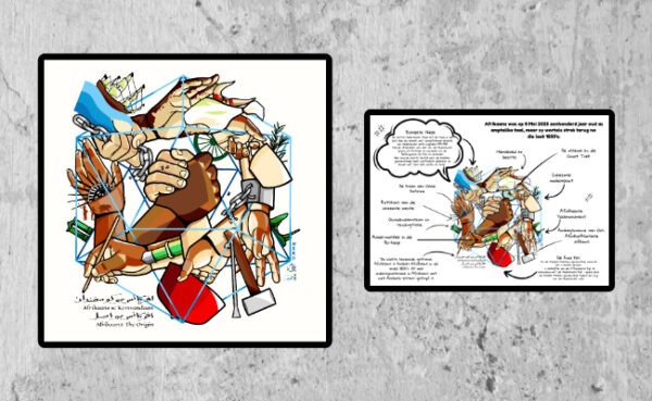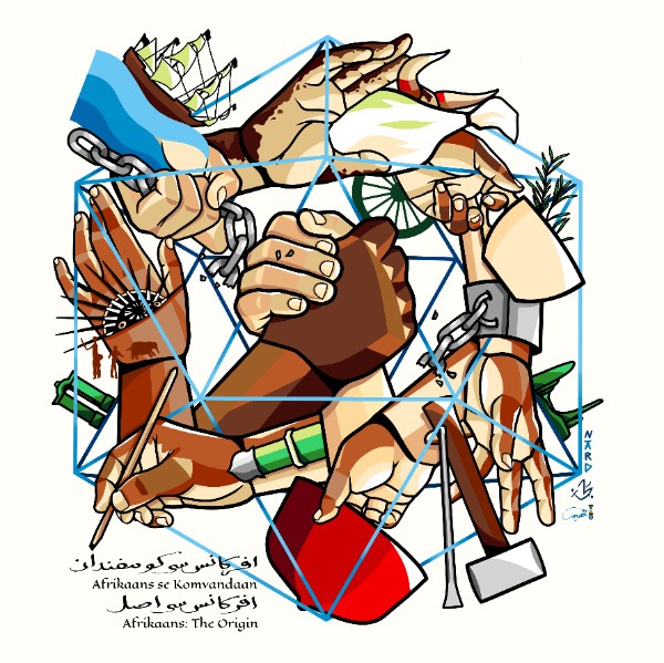 “Dit is ’n plek van ontmoeting, van uitruil, en van gedeelde geskiedenis, iets wat die kunswerk visueel en simbolies tot uiting bring,” sê René Arendse, nasionale adjunkkoördineerder van die Afrikaans 100-veldtog.Die muurskildery is ’n kragtige visuele huldeblyk aan die geskiedenis van Afrikaans getiteld Afrikaans se Komvandaan, en is in die hart van die Bo-Kaap op die buitemuur van ’n huis van een van die inwoners aangebring. Hierdie kunswerk is die resultaat van ’n samewerking tussen die visuele kunstenaar Wisaal Abrahams en die bekroonde straatkunstenaar Nadia Fisher (Nardstar), en is in opdrag van Afrikaans Amptelik 100 uitgevoer.