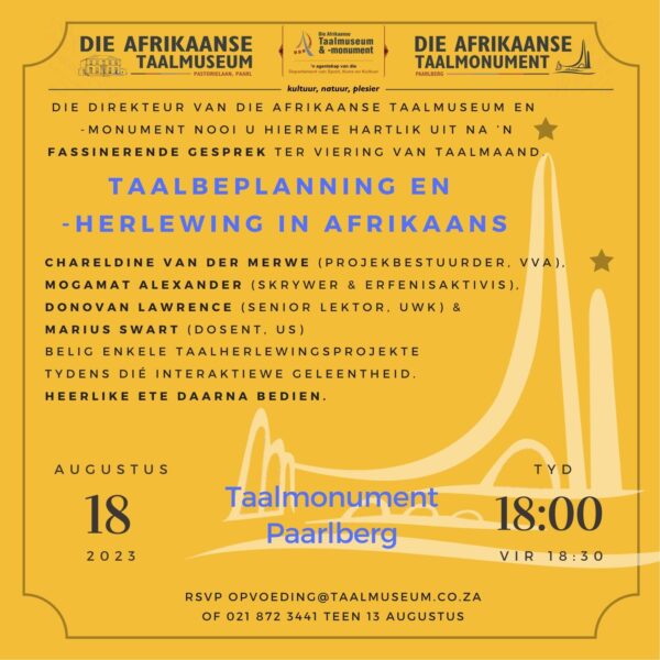 Die direkteur van die Afrikaanse Taalmuseum en -monument (ATM) nooi u hiermee hartlik uit na ’n interaktiewe paneelgesprek ter viering van Taaldag en -maand in Augustus 2023.