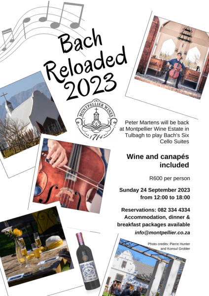 Peter Martens, wat onder andere SAMA-, Fiesta- en Woordfees-toekennings gewen het, sal op 24 September terug wees op die pragtige Montpellier-wynplaas in Tulbagh om JS Bach se ses tjellosuites uit te voer. Elke suite word deur een van Montpellier de Tulbagh se uitsonderlike wyne ‘begelei’ om sodoende ’n unieke proe- en luisterervaring te skep waarby alle sintuie geprikkel word!