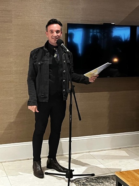 Niël Rademan, uitvoerende hoof van Hessequa Harmonie, spreek gaste toe by die programbekendstellingsfunksie.