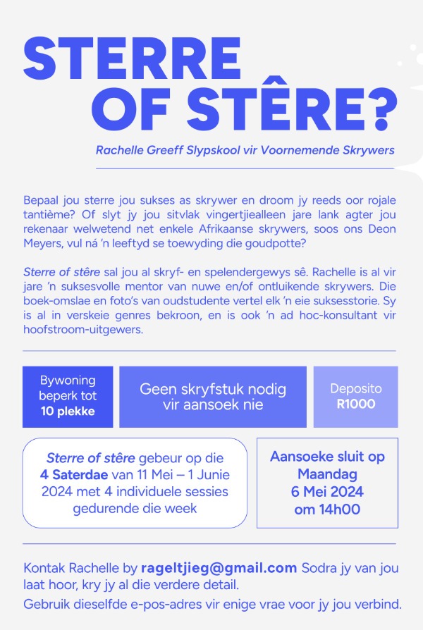 Rachelle Greeff se slypskool vir voornemende skrywers vind weer binnekort plaas.