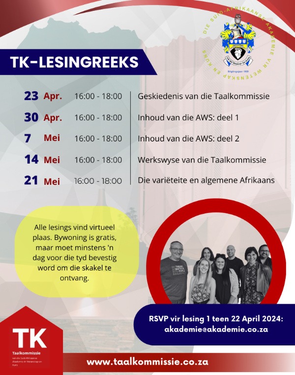 Alle lesings vind virtueel plaas. Daar moet minstens die dag voor die tyd vir elke lesing afsonderlik ge-RSVP word. RSVP’s moet gestuur word aan Sanita Meyer by akademie@akademie.co.za.