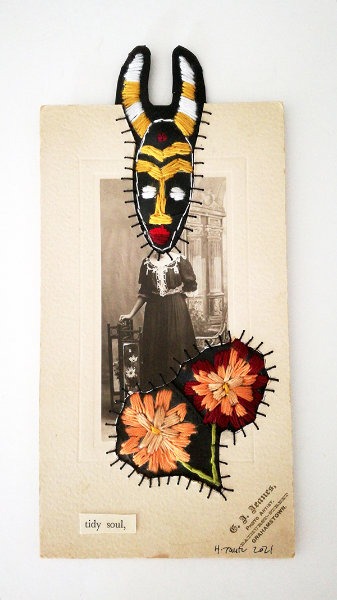 Amplifica - Hannalie Taute TIDY SOUL 2021 Thread, found photograph and rubber 29 x 14 cm unframed