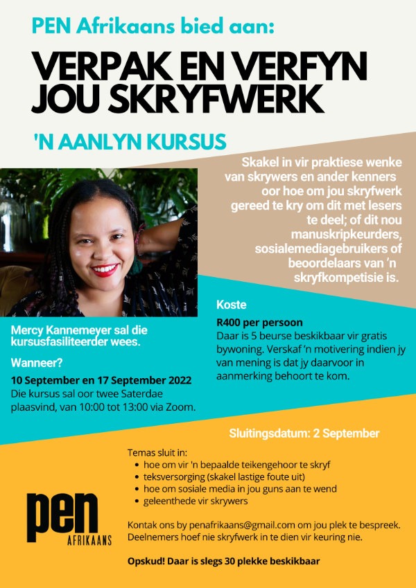 PEN Afrikaans is opgewonde oor die vooruitsig van ’n aanlyn kursus wat op 10 en 17 September (10:00 – 13:00) via Zoom sal plaasvind.