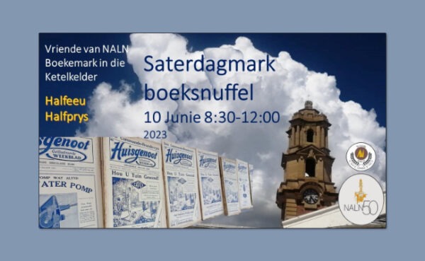 Kom boeksnuffel by Vriende van NALN se opedag op Saterdagoggend 10 Junie 2023 om 08:30–12:00 by die Boekemark in die Ketelkelder. Ria Müller se stel ou Huisgenote en koerante is beskikbaar in NALN se ouditorium. Dit is oortollige materiaal – sy het reeds ’n volledige stel Huisgenote aan NALN geskenk. Pragtige NALN 50-feeskolwyntjies is te koop saam met ’n koppie stomende koffie of tee.