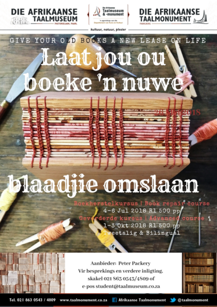 Is jy mal oor jou ou, verwaarloosde hardebandboeke, maar wens jy kon die kuns bemeester om hulle met liefde reg te dokter? Dan is die boekherstelspesialis Peter Packery se kursusse by die Afrikaanse Taalmuseum en -monument (ATM) in die Paarl die antwoord op jou drome. Packery – wat meer as vier dekades se ervaring in boekherstel en -bindwerk, insluitend die herstel van uiters waardevolle boeke, onder die blad het – bied van 4 tot 6 Julie 2018 ’n inleidende kursus oor die herstel van ou hardebandboeke aan. Hy was voorheen by die Suid-Afrikaanse Biblioteek se restourasiedepartement betrokke en het vir 26 jaar sy eie boekherstel en -bindbesigheid bedryf. In Oktober vanjaar bied hy ook ’n gevorderde kursus aan.