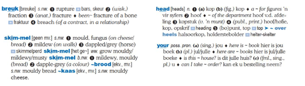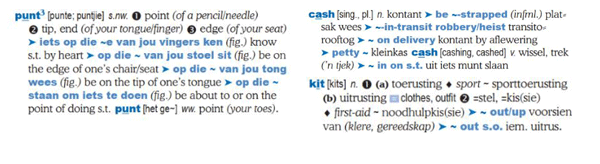 Die woordeboek bied verder ’n magdom algemene frases, kollokasies en vaste uitdrukkings wat nie direk vertaal kan word nie – so kry die leerder leiding oor hoe om frases en uitdrukkings korrek na die teikentaal te vertaal.