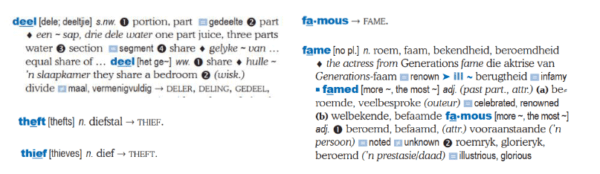 Woorde in woordfamilies se spelling volg nie altyd die alfabetiese volgorde nie (byvoorbeeld deel > deler, deling; thief > theft; famous > fame) en die gebruiker kry dus leiding deur kruisverwysings.