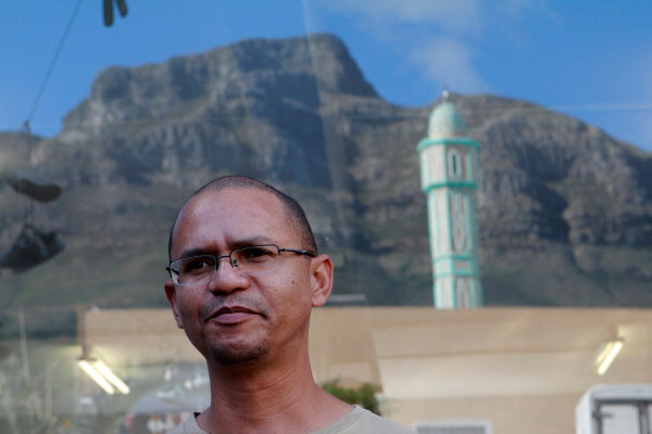 Reflexive: Brandan pausing to think about a question in front of a reflection of the mountain and the nearby mosque. Crossing Bridges Africa aims to help people from different walks of life, religions and cultures to find common ground.