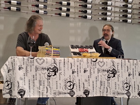 Hoewel die geleentheid 17:30 vir 18:00 is, is dit later 18:30 en geen teken van gesels nie. Dis nou gesels agter die skrywerstafel nie. Want in die proelokaal dreun dit soos mense lag en stories uitruil. Ryger sê: “Ons gee nog so ’n paar minute, is nie aldag wat mens sulke lekker wyn en salami kry nie!”