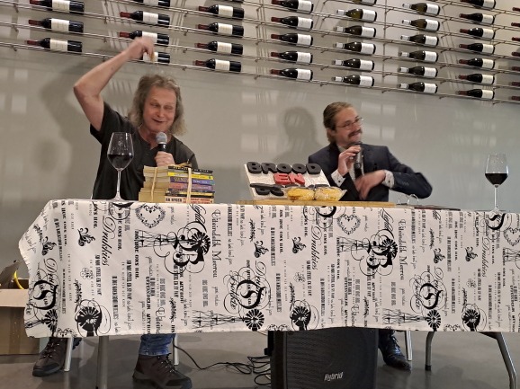 Maar dan, die twee op die “skrywerspodium” – in hierdie geval ’n tafel voor ’n wynmuur waarop staan “??” – is alles behalwe “gewoon”.