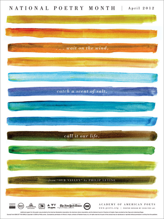Enter The Academy of American Poets. Dis dalk bietjie laat om dit nou agter te kom, maar blykbaar is April (ten minste in Amerika) National Poetry Month. Hierdie projek om poësie te bevorder is in 1996 deur die Academy van stapel gestuur en word wyd gevier deur skrywers, uitgewers, lesers, boekverkopers en sekerlik ook honde, katte, hase en voëltjies oral oor Amerika.