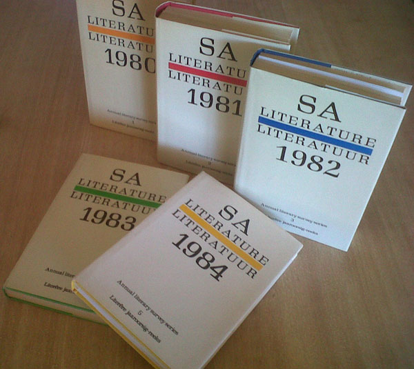 Die jaaroorsigreeks SA Literature/Literatuur van die Raad vir Geesteswetenskaplike Navorsing (RGN) se eertydse Sentrum vir Letterkundenavorsing (Sensal) karteer die stand van sake rondom die publikasie van spesifiek Afrikaanse letterkundeverwante boeke in die eerste helfte van die tagtigerjare. Die oorsigreeks doen verslag oor 85 van hierdie soort titels wat gedurende die tydperk 1980 tot 1985 verskyn het: 20 in 1980; 14 in 1981; 12 in 1982; 9 in 1983; 16 in 1984; 14 in 1985.