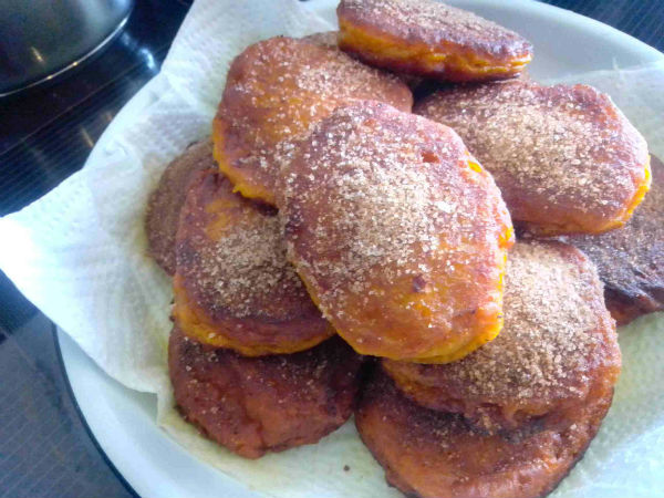 Meng al die bestanddele vir die pampoenkoekies (behalwe die kaneelsuiker en olie) en meng goed. Verhit die olie in ’n pan oor matige hitte en skep lepelsvol van die beslag in die warm olie. Moenie probeer om meer as vier koekies op ’n slag te bak nie – dit maak die pan benoud en die omdraaislag raak ’n bietjie moeilik. Braai eers aan die een kant totdat blasies begin vorm en draai dit dan om, om aan die ander kant ook mooi koperbruin te braai. Skep die koekies met ’n gaatjieslepel en dreineer op handdoekpapier. Strooi kaneelsuiker oor.